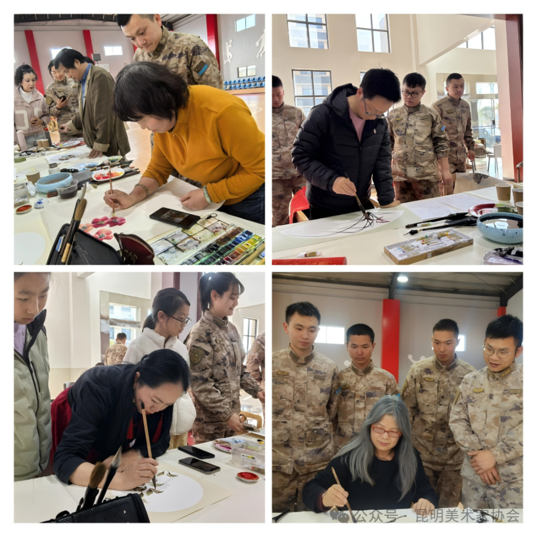 2月6日,昆明美术家协会组织部分中国画艺委会和理事成员到空军驻昆某部开展强基行动“翰墨迎新 书画进军营”主题活动,以书画艺术慰问部队官兵,共迎新春。