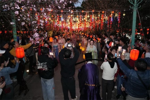 抽到灯谜的市民、游客或凝神思索,或热烈讨论,每当猜中谜底,便兴高采烈地奔向兑奖区。一份份马年小礼品,承载着节日的氛围和祝福,活动现场气氛热烈、笑语盈盈。现场工作人员身着汉服,仿佛从古画中走出,传统古韵油然而生,成为一道流动的风景线,让中华传统文化在互动中悄然传递。
