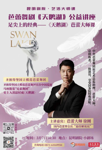 春城三月,高雅艺术再掀热潮。世界著名芭蕾舞团——圣彼得堡国立模范芭蕾舞团《天鹅湖》即将于4月4日、5日登陆昆明。为了让广大观众提前走进芭蕾殿堂,更深层次地领略这部古典巅峰之作的艺术魅力,昆明剧院推出【艺活大师课】公益讲座,特邀中央芭蕾舞团原艺术总监助理、芭蕾大师徐刚,于3月7日14:30在昆明剧院带来《足尖上的经典——<天鹅湖>芭蕾大师课》演前导赏讲座,以专业视角为春城观众进行一次深入浅出的演前导赏。