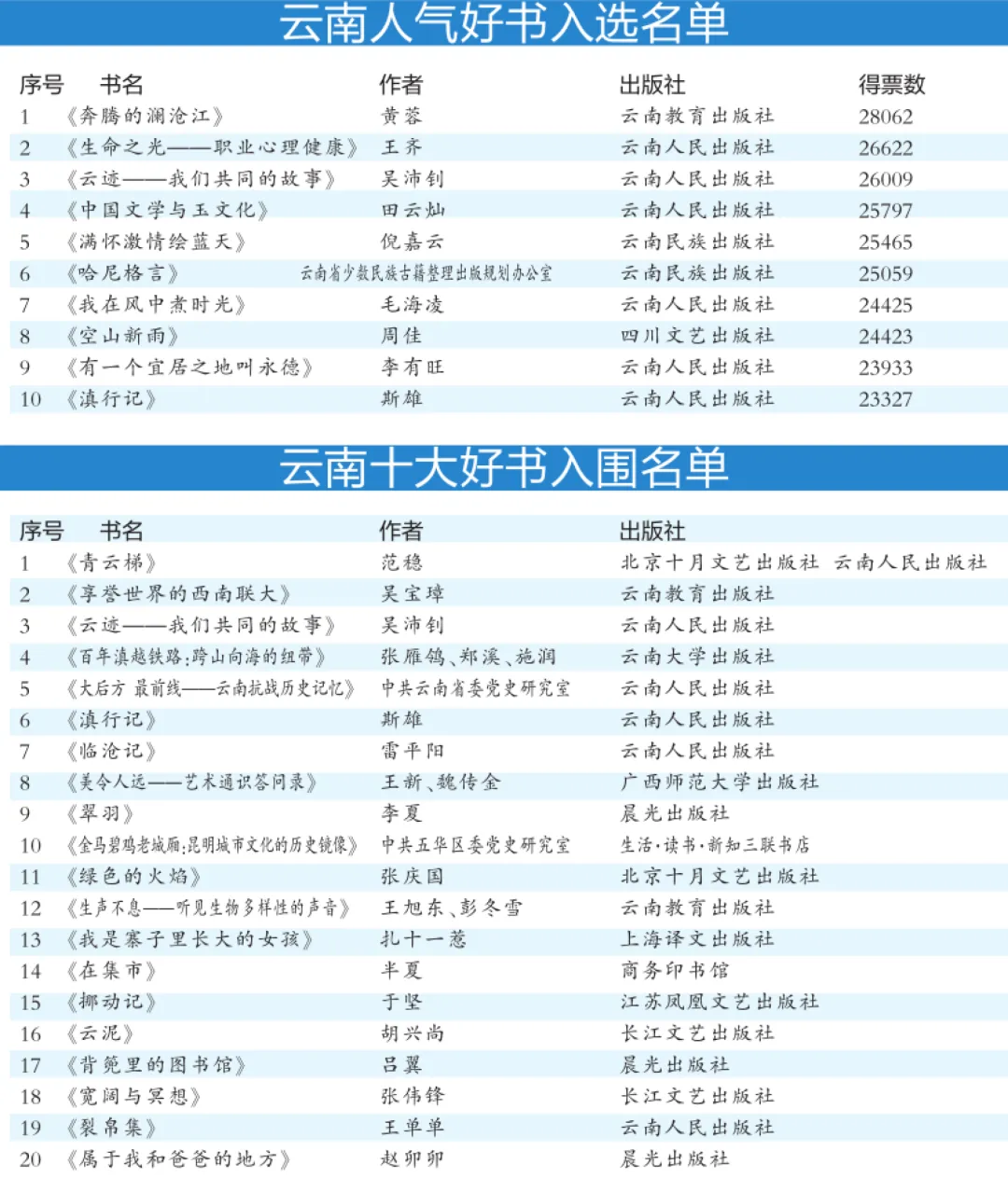近日,第14届“书香昆明”全民阅读系列活动好书推荐之“云南人气好书”入选名单出炉。经读者网络投票,《奔腾的澜沧江》《生命之光——职业心理健康》等10种图书荣膺“云南人气好书”。同时,经9位专家两轮品读和推荐,10种图书被推选为“云南十大好书”,入选名单将于今年“全民阅读活动周”期间揭晓。